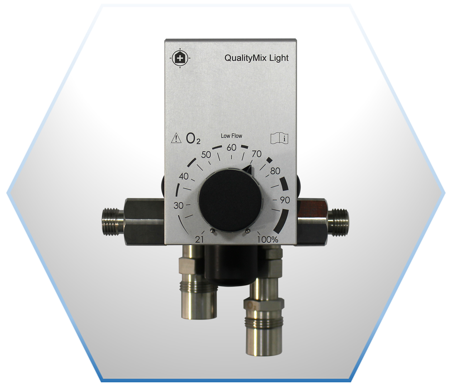 QualityMix Light – The basic O2/AIR blender for all requirements. Reduced to the essentials, without compromising on precision. A two-chamber mixing system for oxygen and compressed air that delivers what it promises. Like its big brother QualityMix, the QualityMix Light also regulates the set value between 21 % and 100 % oxygen content precisely and quickly – with 2 outlets and ABS housing, but without the monitoring option of an attached oxygen monitor.