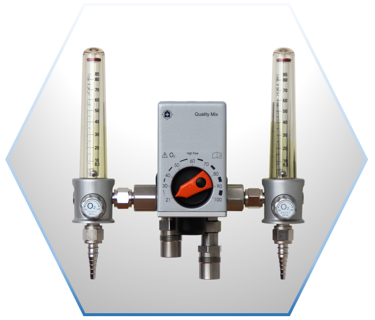 Our worldwide known flagship product. The QualityMix O2 oxygen mixer is used for the continuous and precise supply of a mixture of medical oxygen and medical air for infants, children and adults and is available in LOW Flow and HIGH Flow versions with numerous options – oxygen monitor, bleed valve, pressure regulator (additional or in series), as well as various monitoring options.