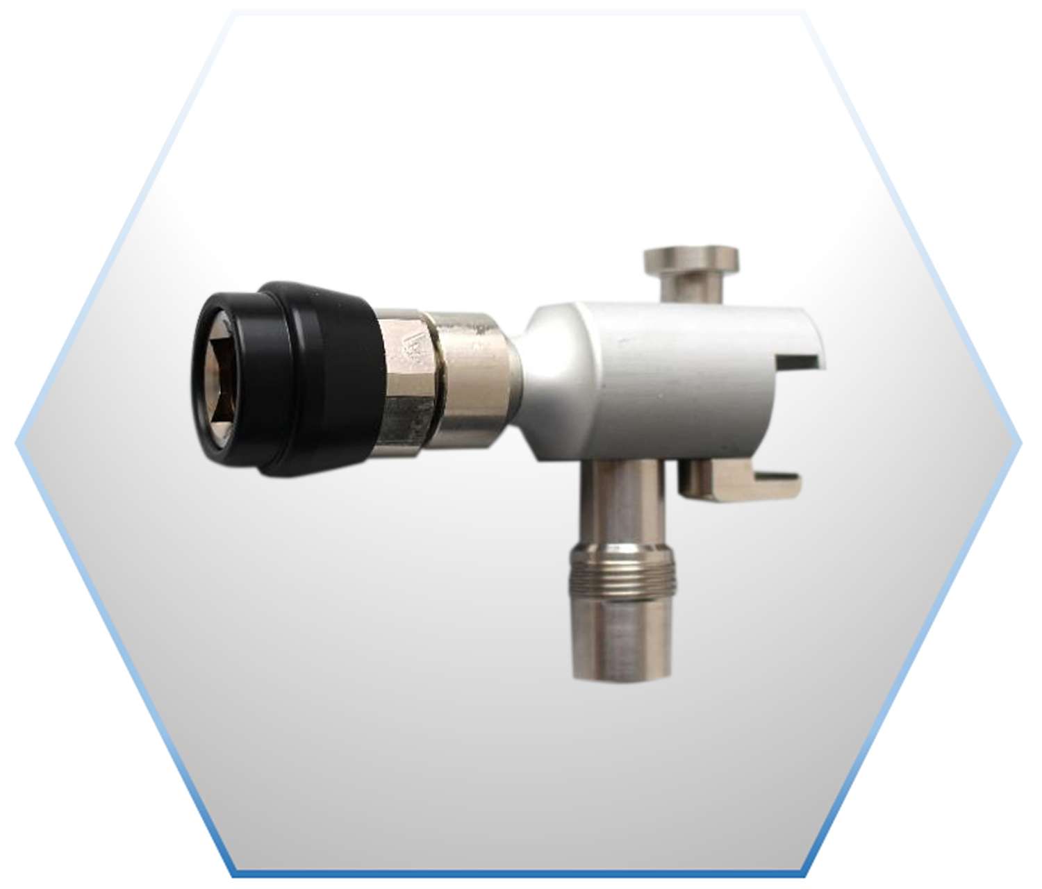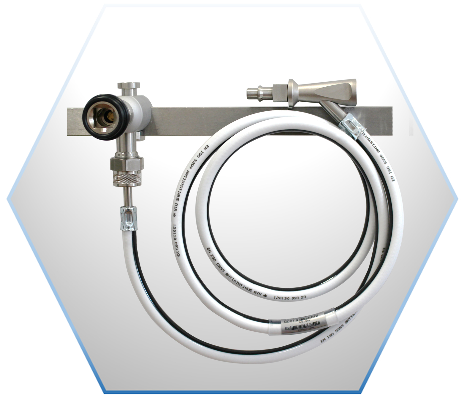 Schienengerät mit Schlauch ZGV auf NIST. Die Lösung wenn die Wandentnahmestelle zu weit entfernt oder ungünstig platziert ist. Individuell konfektionierbar für alle nicht korrosiven Gase und in DIN oder in internationalen Standards lieferbar.