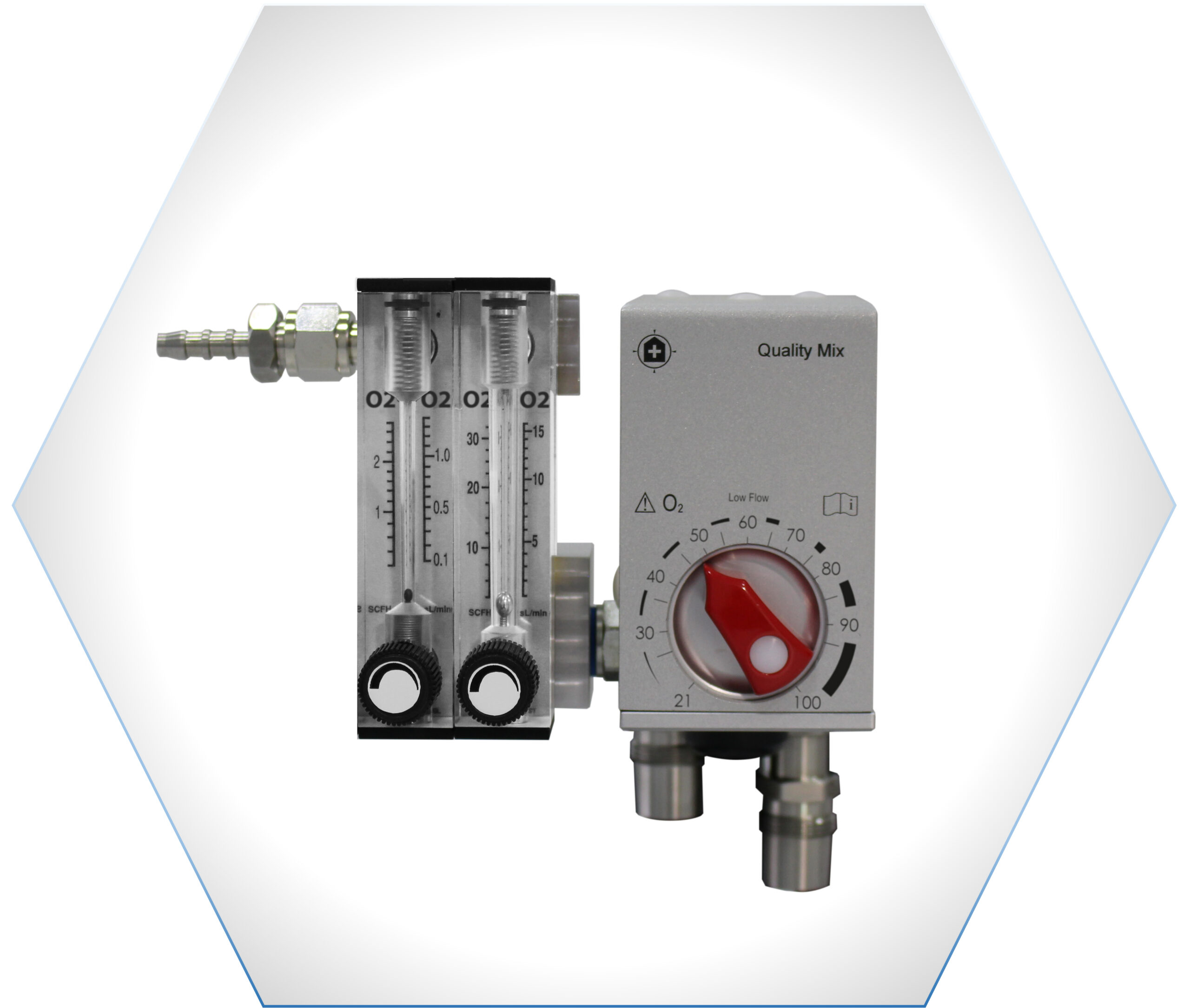 Innovation und Know-how in Druck und Flow von DEHAS. Das Grundmodul des QualityMix Blenders ist ein 2-Kammer-Mischsystem für Sauerstoff und Luft. Der Mischer regelt den Sollwert zwischen 21% und 100% Sauerstoff präzise und schnell. Hier in der kompakten Version mit 2 fest verbauten Flowmetern 0 – 15 l/min O2/AIR und 0 – 1 l/min O2/AIR.